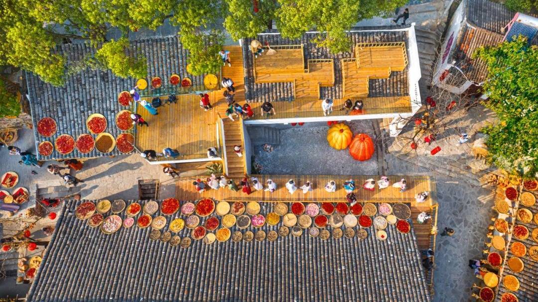 在大余湾,晒秋是镌刻在石墙黛瓦间的诗意。簸箕托起系数这个词秋天的赠给,火红的辣椒、金黄的玉米、橙黄的南瓜、褐色的板栗……重重叠叠铺展在檐下、院中、屋顶,与明清时期的古建造交相照映,泼洒出中国最活泼的秋日油画。