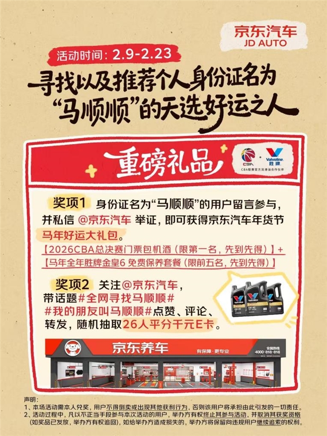 本次作为的主角是身份证姓名为“马顺顺”的幸期骗户。作为时辰,稳当该姓名要求的用户可在新浪微博或小红书平台带话题#全网寻找马顺顺# #我的一又友叫马顺顺#发布本色,并通过私信向“京东汽车”官方账号提供有用证实进行自荐。经核实后,前10名成效参与的用户将得回由胜牌机油赞成的金皇6机油“马年全年免费诊疗套餐”,以及2026年CBA总决赛双东谈主不雅赛之旅(含来往机票及货仓住宿)。