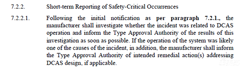 又如,7.2.2安全事故的短期阐扬要求,主机厂应在第一时分对事故作念出探望,判断是否与DCAS操作联系,并在第一时分将探望后果陈述型式批准机构。淌若系统的操作可能是事故的原因之一,主机厂还应上报拟采纳的援救法式。