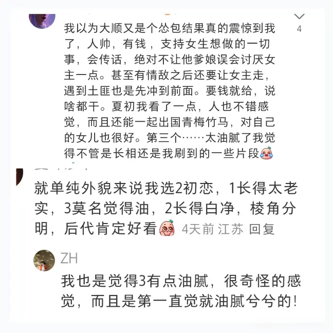 在某搪塞平台上,有网友发起权略,问在陈大顺、夏初、闻知秋这三个东谈主中选一个作念老公,你会选谁,简直扫数的东谈主王人暗示不会选闻知秋,王人合计闻知秋太浓重了。