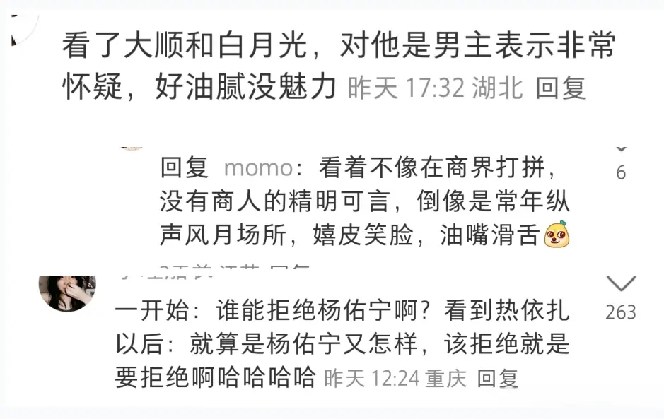 也许是夏初和陈大顺太好了,好多不雅众王人不禁受他和褚韶华多情怀戏。有的说:“看了大顺和白蟾光,对他是男主暗示极度怀疑,好浓重,莫得魔力。”有的说:“不像在商界打拼,莫得商东谈主的考究可言,倒像是终年任意风月形势,嬉皮笑貌,油腔滑调。”有的说褚韶华该间隔就要间隔。