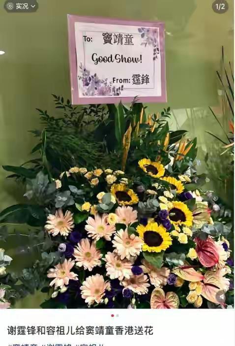 10月4日,有网友在窦靖童香港演唱会现场拍到了谢霆锋送来的花篮。花篮上写着“Good show”的祈福语,看起来和其他明星的没什么不同。