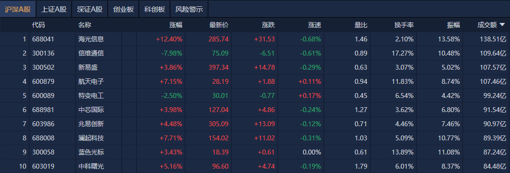 个股方面云开体育,海光信息成交额超138亿元居首,信维通讯、新易盛、航天电子成交额靠前。