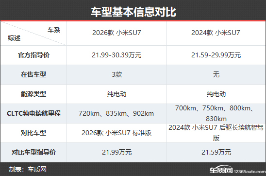 2026款小米SU7共推出3款车型,数目上少于2024款车型。官方开采价方面,受竖立晋升影响,新款车型价钱小幅上调,但依旧不错称得上是衷心满满。本次对比选取的两款车型均为初学版块,同期亦然新老变化最为彰着的车型,更便于直不雅呈现互异。